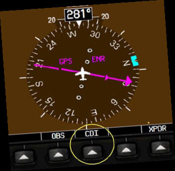 3. On the G1000 PFD, press the CDI softkey until the HSI indicates GPS ENR. The HSI indication and the needle graphic will change color to pink.
